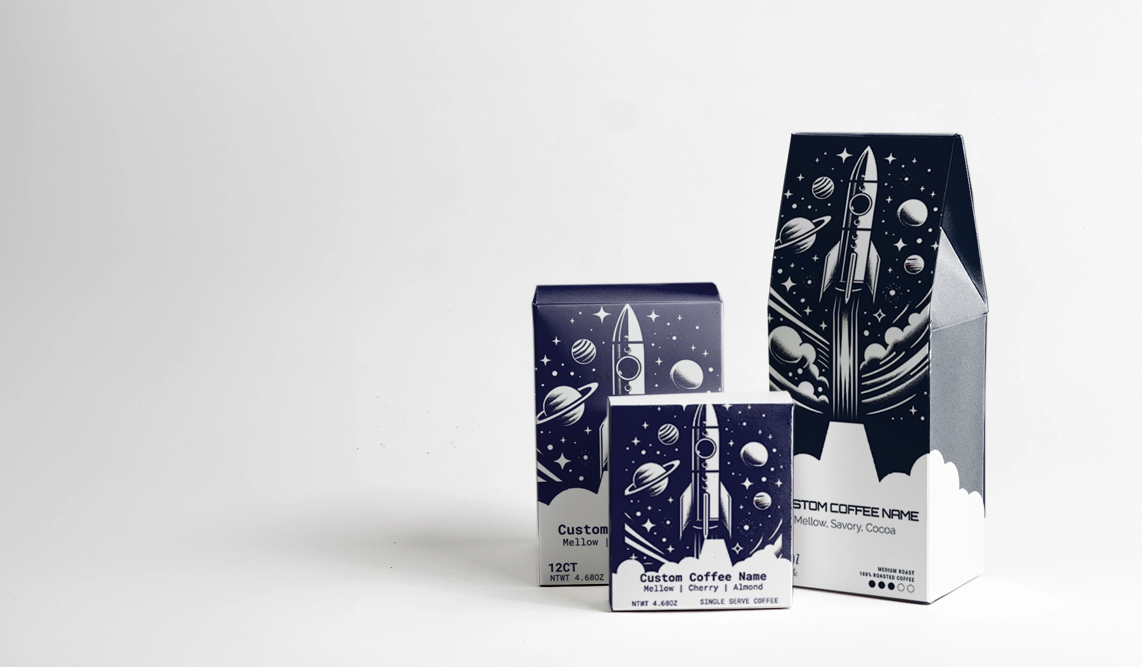 We offer 12oz bags available in both whole bean and ground, single-serve coffee pods (K-cup compatible, 12 per box), instant coffee (6 freeze-dried packets per box), and mushroom coffee and matcha blends. 12oz bags are available on all plans. Pods, instant, matcha, and mushroom formats require a Pro plan ($49/mo) or higher. All coffees are specialty grade, scored 80 or above on the SCA 100-point scale.